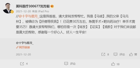 此外,去年12月,刘方毅还转发了一条微博网友父亲生病求助的微博。