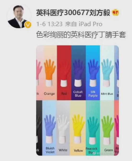 今年1月6日,刘方毅还为英科医疗生产的“彩色手套”代言。
