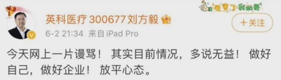 面对呼啸而来的质疑之声,刘方毅显得较为淡定。6月2日,英科医疗股价跌停后,刘方毅发了一条微博“其实目前情况,多说无益!做好自己,做好企业!放平心态”,作为对投资者质疑的回应。