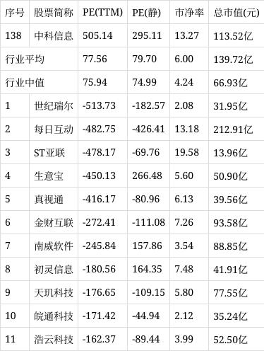 从行业市盈率排名来看,公司所处的互联网服务行业市盈率平均77.56倍,行业中值75.94倍,中科信息排名第138位。