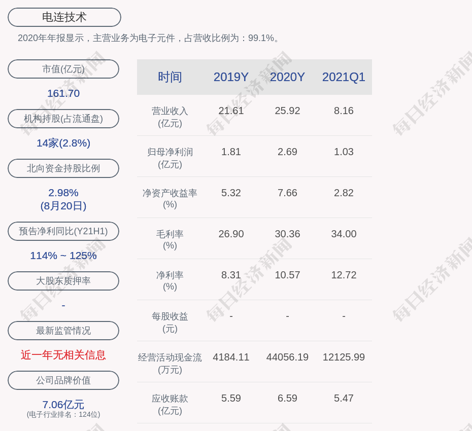 2020年年报显示,电连技术的主营业务为电子元件,占营收比例为:99.1%。