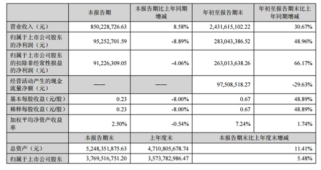 集微网消息,10月27日晚间,电连技术发布公告称,2021年前三季度实现营收24.32亿元,同比增长30.67%,实现净利润8.50亿元,同比增长8.58%。其中,第三季度实现净利润9525.27万元,同比下滑8.89%。