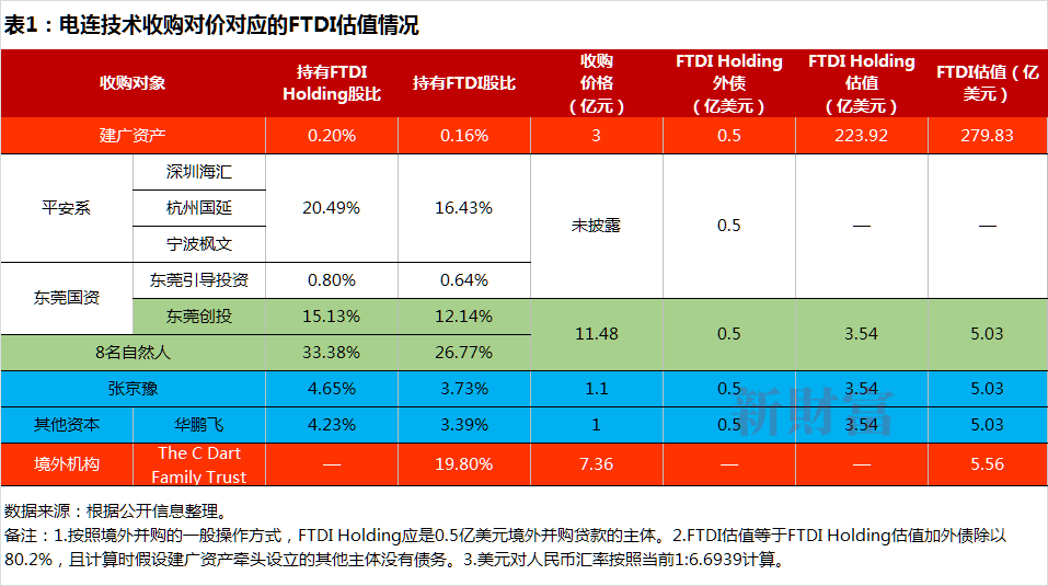 电连技术目前只披露了计划以13.58亿元对价,收购9名自然人、华鹏飞、东莞创投等控制的FTDI股权。对于平安系的3家投资机构和东莞引导投资控制的FTDI股权,电连技术尚未明确收购价格。