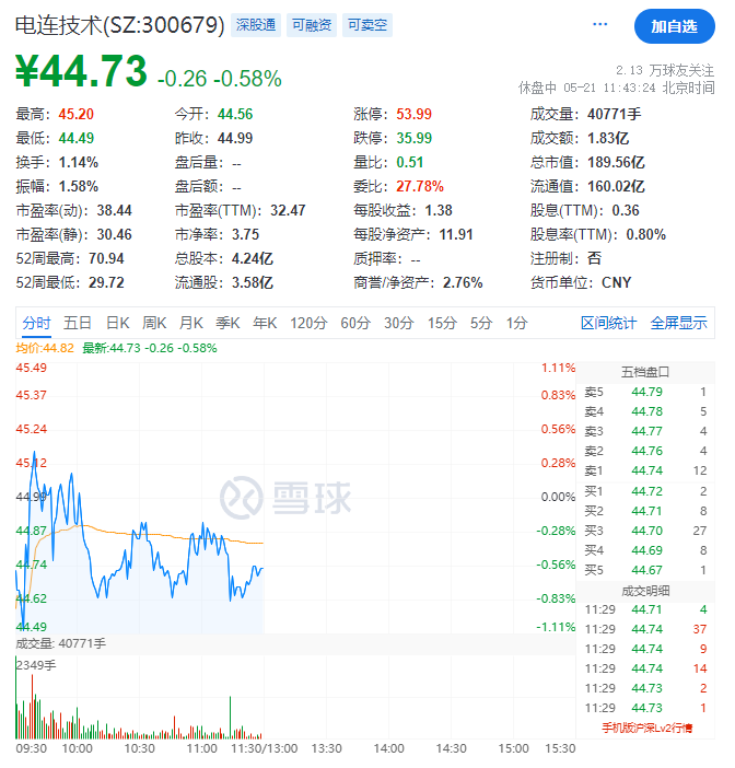 但和良好的业绩相比,电连技术在二级市场上的表现略显疲软。截至5月21日午间收盘,电连技术跌0.58%,报44.73元/股,最新市值189.56亿元,今年来累计下跌超两成。