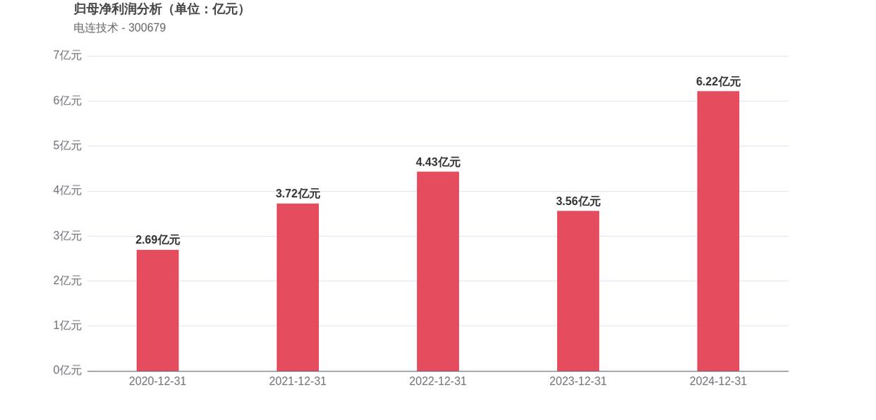 利润角度分析,2020年电连技术实现归母净利润2.69亿元,2024年6.22亿元。公司盈利能力在2023年短暂下滑后,2024年强势回升,归母净利润同比增长74.73%。