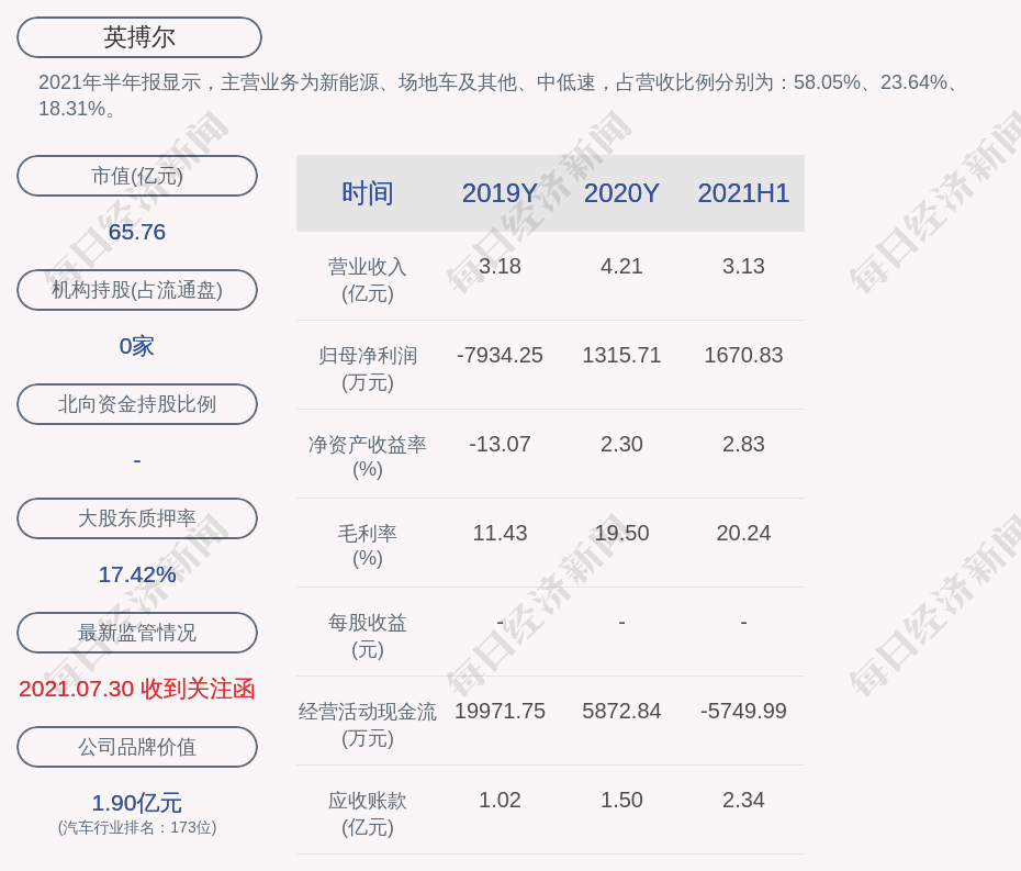 2021年半年报显示,英搏尔的主营业务为新能源、场地车及其他、中低速,占营收比例分别为:58.05%、23.64%、18.31%。