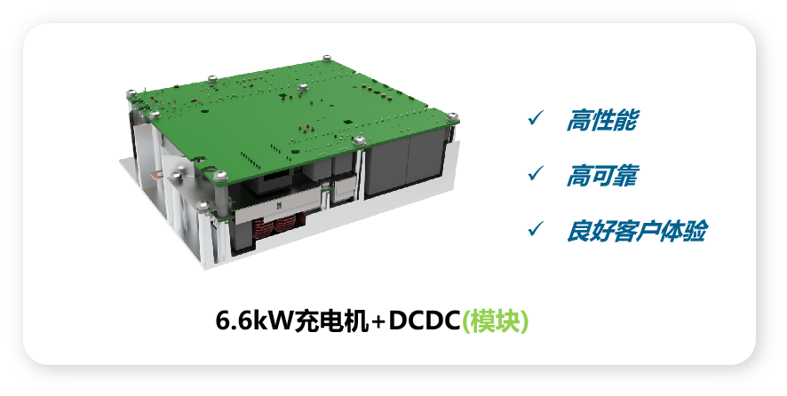 其中,6.6kW全国产器件车载电源二合一产品将车载充电器(OBC)与车载直流变换器(DCDC)集成,采用全国产化、全车规化器件,功能安全、信息安全;遵循AUTOSAR软件开发架构,这一突破撕开了进口器件的封锁,有效解决了缺芯危机,为客户提供了保供的坚固屏障。
