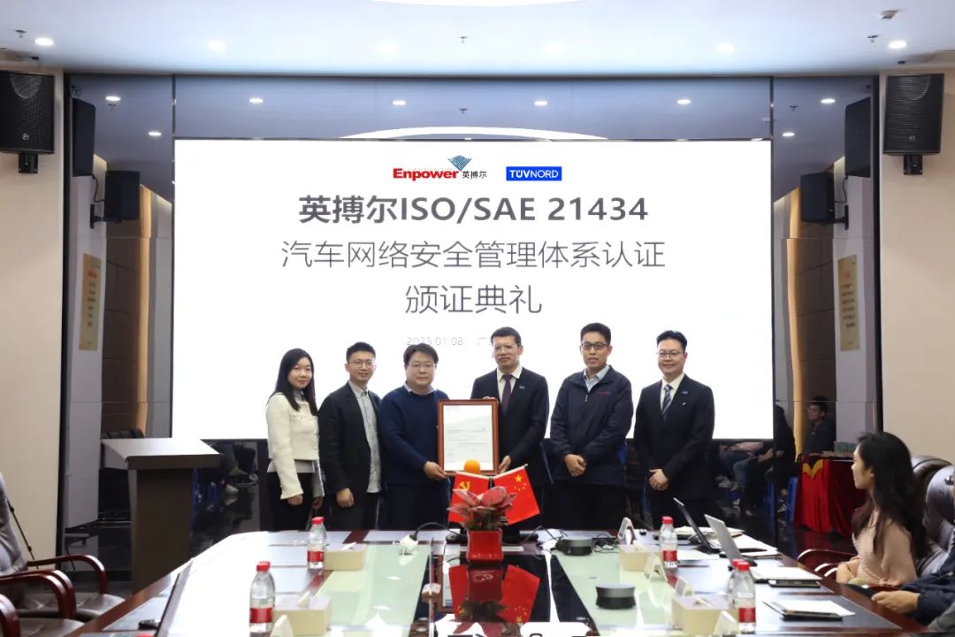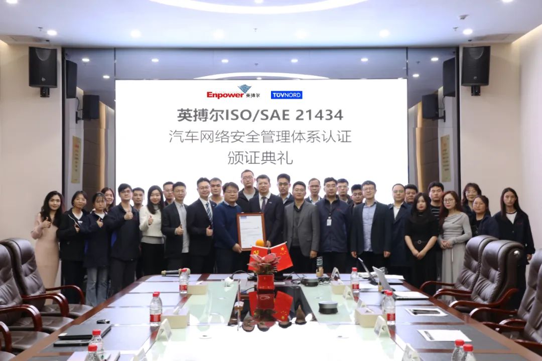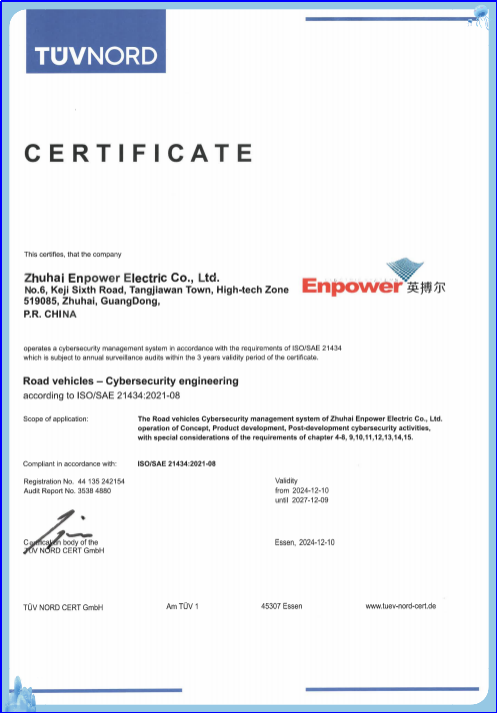 英搏尔一直致力于为客户提供高质量、高可靠性的产品。从研发管理,生产管理到信息管控等诸多方面依照标准要求,并结合企业现有的开发流程和质量管理体系,完成了网络安全管理体系的全面搭建以及落地实施,得到了TüV NORD认证中心的独立审核和批准通过。这一认证不仅证明了英搏尔在产品开发流程中的严谨性和先进性,也展现了我们对网络安全的深刻理解和全面准备。