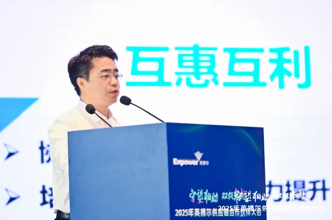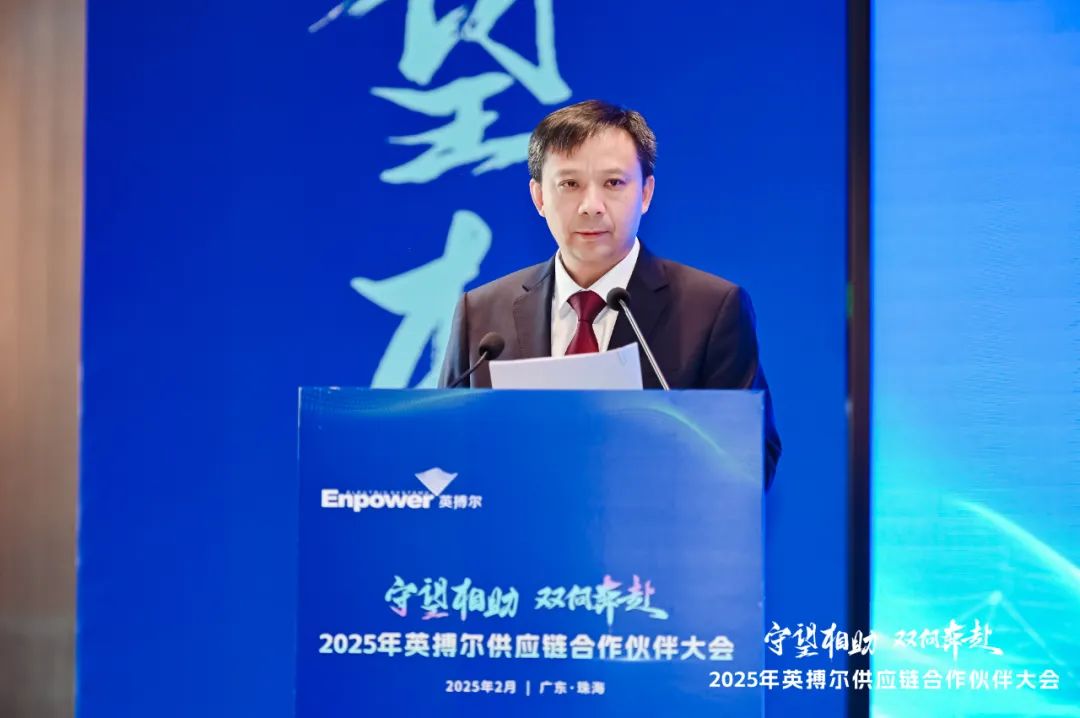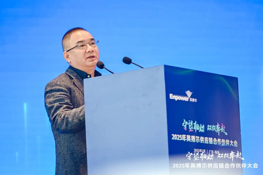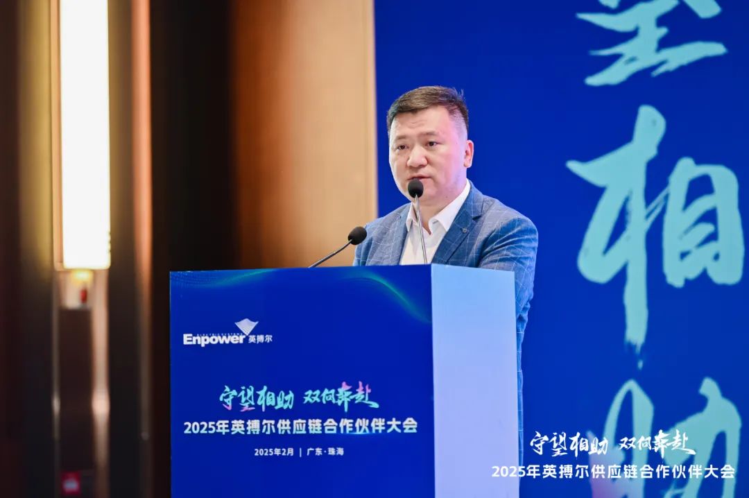 供应链总监杨冬彬向大会做《新能源汽车行业供应链趋势及英搏尔供应链管理理念》主题演讲,杨总深入分析了当前供应链发展趋势,提出我们即将面对的机遇和挑战,宣贯了英搏尔“强强联合、确保安全、互惠互利、立足长远”的供应链管理理念,并要求供应商伙伴们立足2025年目标、总结2024年差距,以质量为基础,持续优化成本、确保准时交付、提升信息协同、深度优化合作,在联合市场竞争中实现双赢。