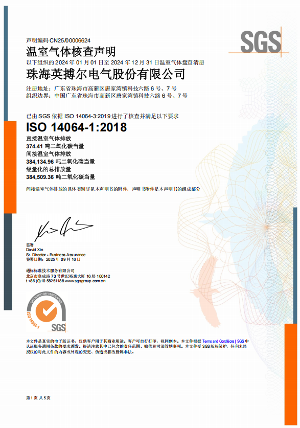 在全球“双碳”目标加速推进、气候治理成为全人类共同使命的当下,企业作为绿色转型的核心力量,正以实际行动践行环保责任。2025 年 10 月,英搏尔凭借对绿色发展的坚定追求与科学管理,成功获得 SGS 颁发的 ISO14064 温室气体管理体系核查认证——这不仅是企业自身碳管理能力的权威认可,更是其以国际标准为标杆,助力行业节能减碳、推动全球气候治理的重要里程碑。