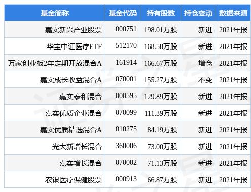 根据2021年报基金重仓股数据,重仓该股的基金共155家,其中持有数量最多的基金为嘉实新兴产业股票。嘉实新兴产业股票目前规模为106.61亿元,最新净值3.913(3月22日),较上一日下跌0.96%,近一年下跌18.78%。该基金现任基金经理为归凯。归凯在任的公募基金包括:嘉实泰和混合,管理时间为2016年3月10日至今,期间收益率为105.25%;嘉实增长混合,管理时间为2018年12月4日至今,期间收益率为81.99%;嘉实瑞和两年持有期混合,管理时间为2020年4月9日至今,期间收益率为-0.63%。
