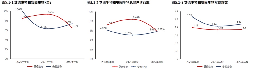 艾德生物ROE的下滑主要来源于总资产报酬率的下滑。2022半年报艾德生物ROE6.48%,较2021半年报减少2.96个百分点,股东回报水平降低。总资产报酬率5.85%,较2021半年报减少2.55个百分点,总资产回报水平降低。权益乘数1.11倍,较2021半年报提高0.01倍,股东权益撬动资产的能力基本稳定。
