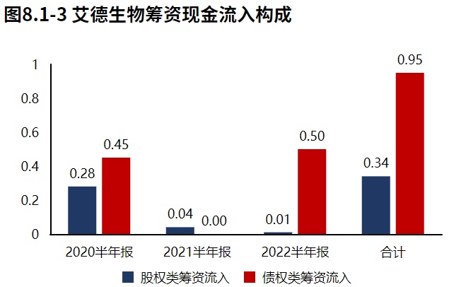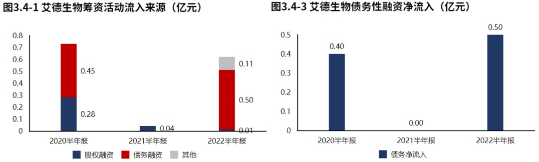 公司融资方式以债权流入为主。2022半年报艾德生物筹资活动现金流入0.61亿元,其中股权流入63.00万元,债权流入0.50亿元,债权净流入0.50亿元,公司可能正在进行非必要融资。