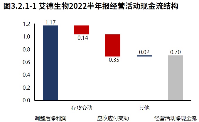 上下游资金的占用导致大量垫资,从而影响了经营活动变现能力。艾德生物2022半年报经营活动调整后盈利1.17亿元,提前备货导致现金流出0.14亿元,应收应付变动导致现金流出0.35亿元,其他因素导致现金流入182.88万元,最终经营活动实现现金净流入0.70亿元。艾德生物经营活动变现能力较差,主要是因为应收应付变动导致大量垫资。