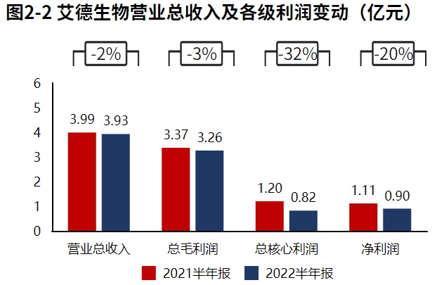 公司业绩下滑。2022半年报艾德生物营业总收入3.93亿元,同比增速-2%,毛利润3.26亿元,同比增速-3%,核心利润0.82亿元,同比增速-32%,净利润0.9亿元,同比增速-20%。