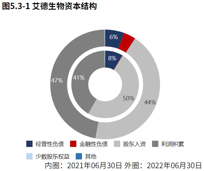 公司在资金来源上表现出留存资本支撑度增加的趋势。从2022年06月30日艾德生物的负债及所有者权益结构来看,公司的资本引入战略为均衡利用利润积累、股东入资的并重驱动型。其中,利润积累是资产增长的主要推动力。与2021年06月30日相比,留存资本占比明显增长,股东入资占比明显降低,公司在资金来源上表现出留存资本支撑度增加的趋势。