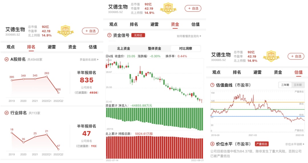截至2022Q2,艾德生物在A股的整体排名下降至第835位,在医疗器械行业中的排名下降至第47位。截止2022年9月21日,北上资金并无特别信号。以近三年市盈率为评价指标看,艾德生物估值曲线处在严重低估区间。