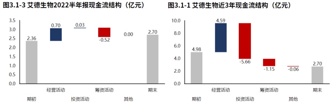 从艾德生物2022半年报的现金流结构来看,期初现金2.36亿元,经营活动净流入0.70亿元,投资活动净流入295.44万元,筹资活动净流出0.52亿元,累计净流入0.35亿元,期末现金2.70亿元,经营活动具有一定的造血能力。