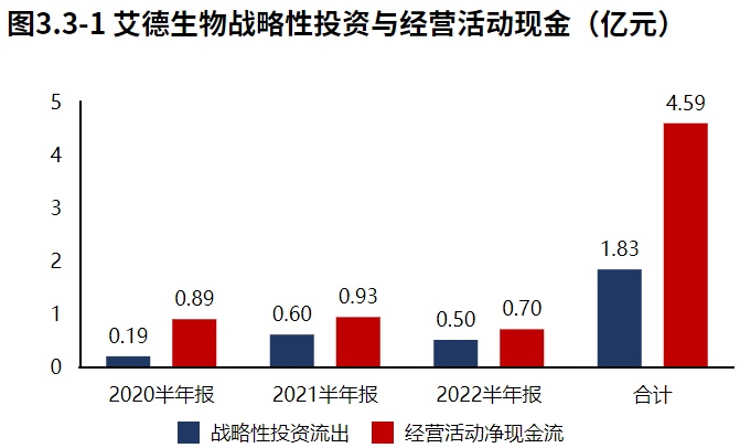 经营活动的造血能力能够覆盖战略投资的资金流出。艾德生物2022半年报战略投资资金流出0.50亿元,较2021半年报减少0.10亿元,增速-16.60%,战略性投资的资金投入有所降低。艾德生物2020年报到本期战略投资资金流出1.83亿元,经营活动产生现金净流入4.59亿元,经营活动的造血能力能够覆盖战略投资的资金流出。