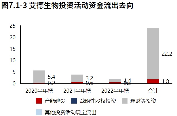 投资流出减少,主要流向了理财等投资。艾德生物2022半年报的投资活动资金流出,理财等投资占比最大,占比72.94%。艾德生物2020年报到本期的投资活动资金流出,集中在理财等投资,占比92.38%。