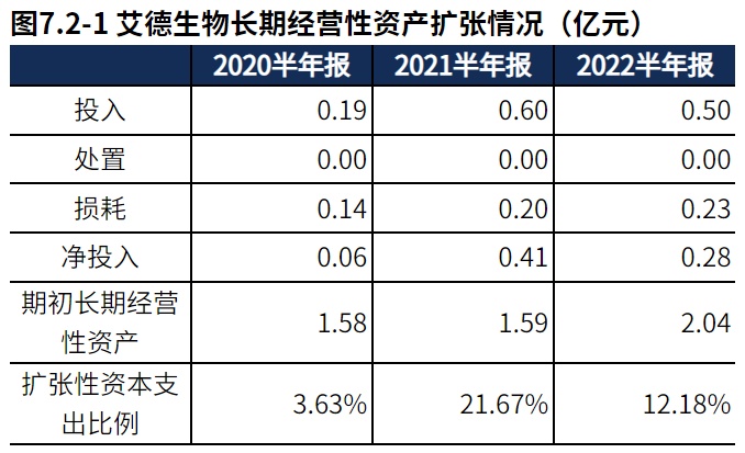产能有所收缩。2022半年报艾德生物产能投入0.50亿元,处置0.00元,折旧摊销损耗0.23亿元,新增净投入0.28亿元,与期初经营性资产规模相比,扩张性资本支出比例12.18%。