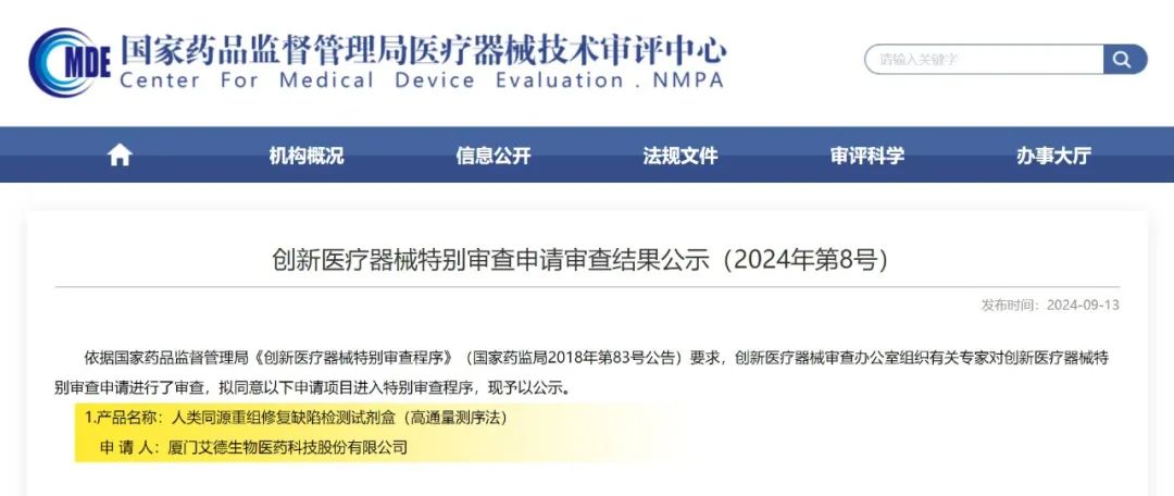 近日,国家药监局(NMPA)医疗器械技术审评中心发布公示,艾德生物“人类同源重组修复缺陷检测试剂盒”(简称:“HRD试剂盒”)进入创新医疗器械特别审查程序,是我国目前唯一被纳入创新医疗器械的HRD试剂盒,也是艾德生物第三个获得NMPA“创新医疗器械”认定的产品。