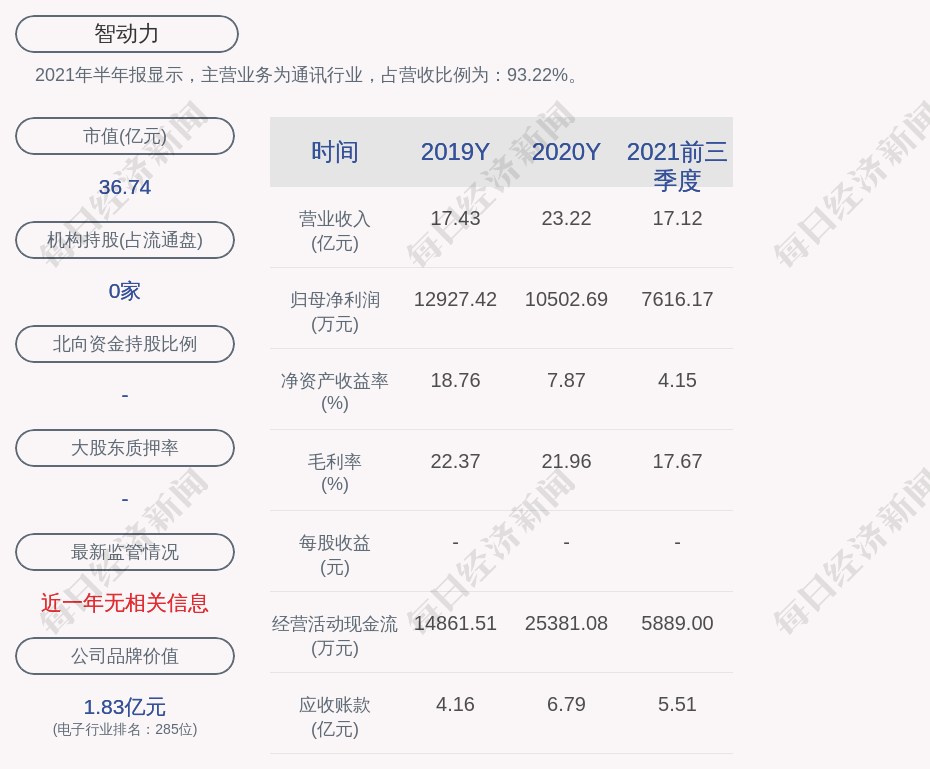 2021年半年报显示,智动力的主营业务为通讯行业,占营收比例为:93.22%。