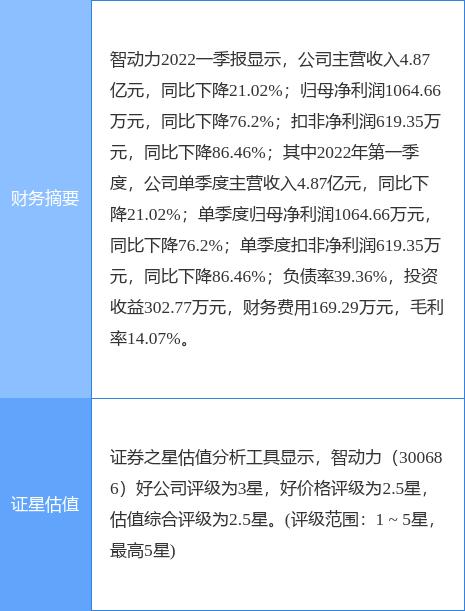智动力公布2022年第一季度报告,公司实现营业收入4.87亿元,同比下降21.02%;归母净利润1064.66万元,同比下降76.20%;基本每股收益0.0403元。