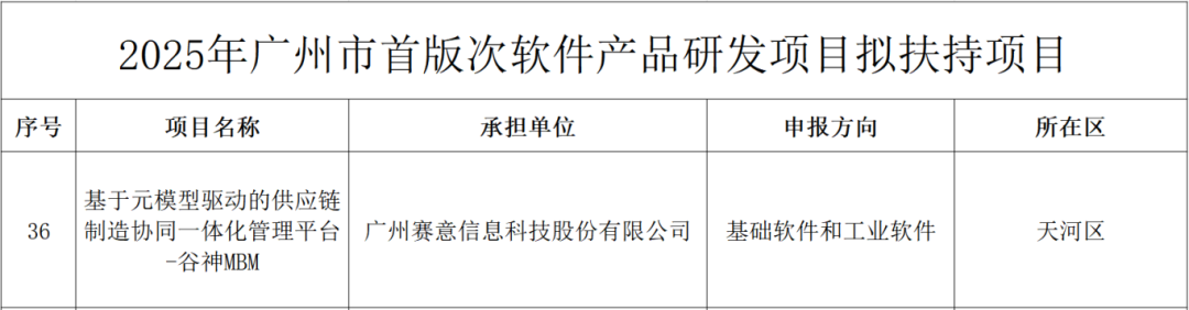 近期,广州市工业和信息化局正式公布2025年度首版次软件产品研发项目名单。赛意信息基于元模型驱动的供应链制造协同一体化管理平台-谷神MBM凭借国产化核心基础软件技术先进性、关键领域技术突破性以及强大的应用落地能力成功入选。该认定是广州政府对拥有自主知识产权、运行安全可靠、功能性能达到国内领先及以上、打破行业封锁与垄断和具备重大市场潜力的核心软件产品的权威认可。