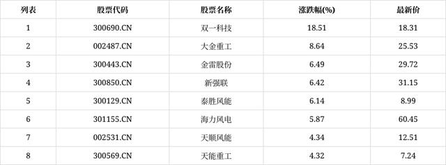 今日午盘,截至13:15,风电设备板块拉升。双一科技(300690.CN)涨18.51%报18.31元,大金重工(002487.CN)涨8.64%报25.53元,金雷股份(300443.CN)涨6.49%报29.72元,新强联(300850.CN)涨6.42%报31.15元,泰胜风能(300129.CN)涨6.14%报8.99元,海力风电(301155.CN)涨5.87%报60.45元,天顺风能(002531.CN)涨4.34%报12.51元,天能重工(300569.CN)涨4.32%报7.24元。