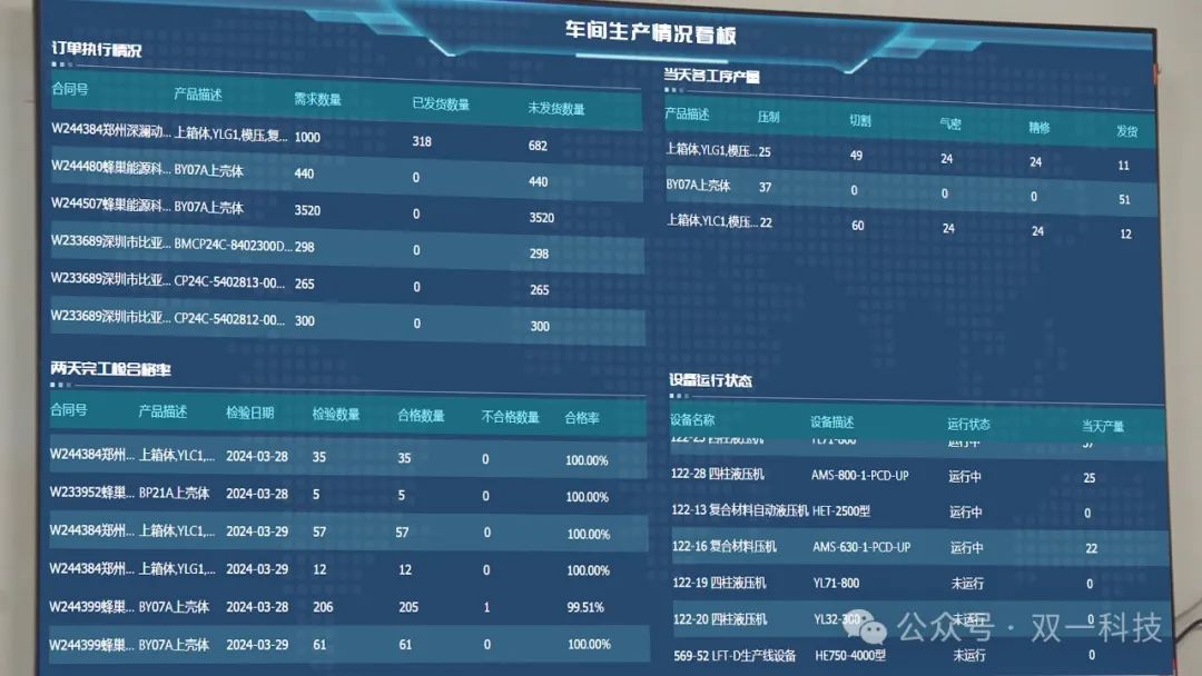 在数字化浪潮的推动下,双一科技紧跟时代步伐,于2023年将车辆零部件车间升级改造为数字化车间。通过引入PLC设备数字采集系统,可对生产设备关键数据、车间温湿度等工作环境数据进行实时采集,再通过PDA扫码,将相关生产数据关联到产品,使数据在设备、信息化系统、产品之间有序流动,实现了对原材料、生产进度、工艺执行情况的实时监控,对质量情况的全过程追溯,保障了产品质量,提高了工作效率,做到了以高效生产为核心,人、机、料、法、环、测等生产要素的相互融合,提高了车间运行管理水平,为企业持续发展注入新活力。