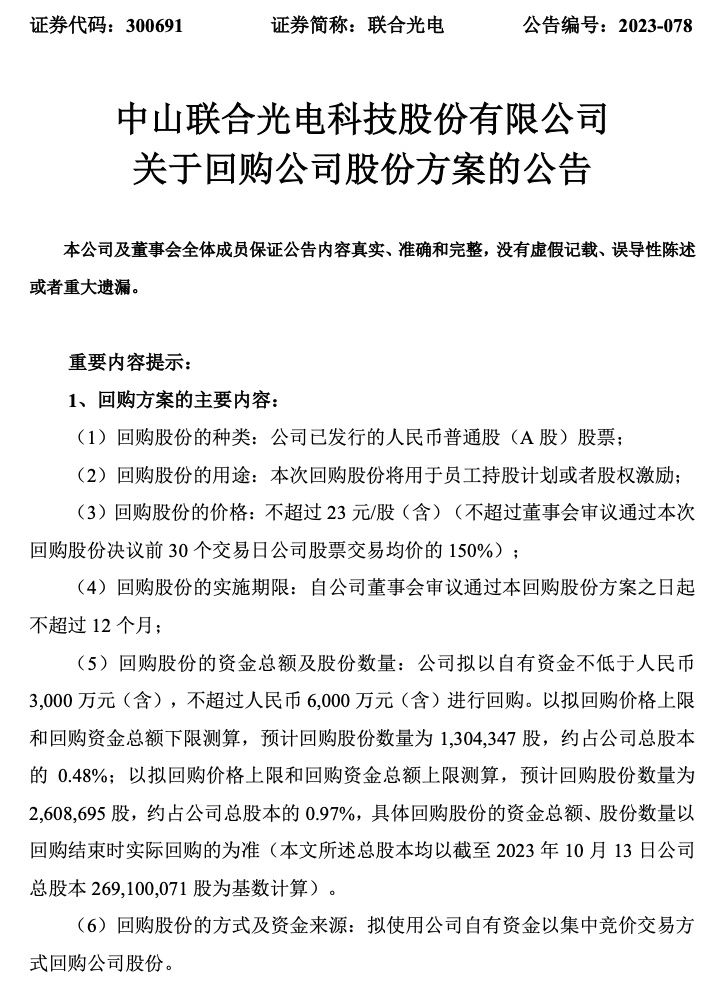 联合光电同时公告称,拟以不超过23元/股回购公司股份,回购金额不低于3000万元且不超过6000万元。