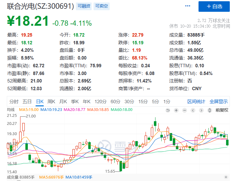 截至10月20日收盘,联合光电报收18.21元/股,下跌4.11%,总市值49.00亿元。