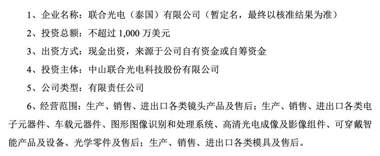 据悉,因业务发展和战略布局需求,联合光电拟在泰国设立控股子公司并投资建设境外生产基地,以进一步提升公司的国际竞争力和市场服务能力,此次计划投资金额不超过1000万美元(实际金额以中国及泰国当地主管部门批准金额为准),投资金额将用于设立子公司、购买固定资产等相关事项,公司将根据市场需求和业务进展等具体情况分阶段实施建设泰国生产基地。