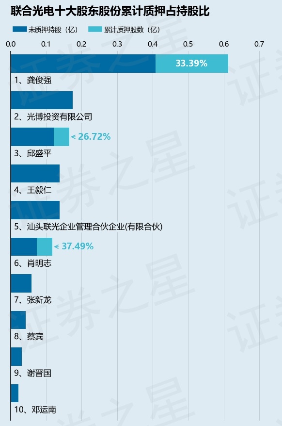 截止本公告日,股东龚俊强已累计质押股份2045.0万股,占其持股总数的33.39%,股东邱盛平已累计质押股份442.0万股,占其持股总数的26.72%,股东肖明志已累计质押股份442.0万股,占其持股总数的37.49%。本次质押后联合光电十大股东的累计质押股份占持股比例见下图: