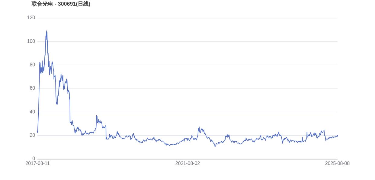 联合光电自2017年8月11日上市至今,已迎来8周年。从上市首日收盘价为22.98元、市值19.66亿元,到如今市值达到52.87亿元。