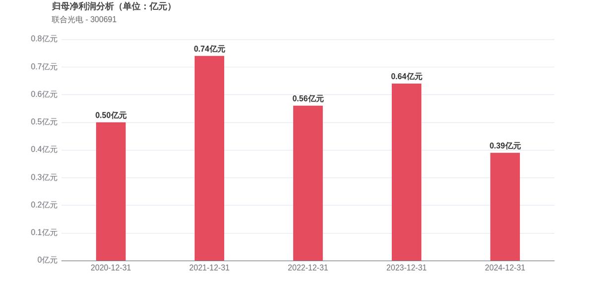 利润角度分析,2020年联合光电实现归母净利润0.50亿元,2024年0.39亿元。盈利水平出现一定波动。