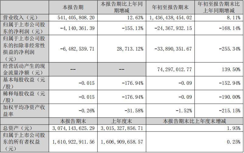 然而,净利润方面面临挑战。本报告期内,归属于上市公司股东的净利润为-414.04万元,同比下降155.13%;归属于上市公司股东的扣除非经常性损益的净利润为-648.25万元,同比大幅下降28713.12%。年初至报告期末,归属于上市公司股东的净利润为-2436.79万元,同比下降168.14%;归属于上市公司股东的扣除非经常性损益的净利润为-3389.04万元,同比下降255.34%。