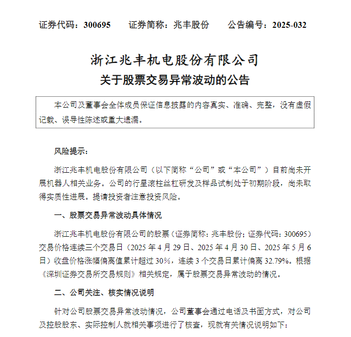 2025年5月6日,兆丰股份(300695.SZ)发布股票交易异常波动公告称,公司股价连续三个交易日(4月29日、4月30日、5月6日)累计涨幅达32.79%,触发深交所异常波动标准。公告重申,公司目前尚未开展机器人相关业务,其行星滚柱丝杠研发及样品试制处于初期阶段,尚未取得实质性进展。