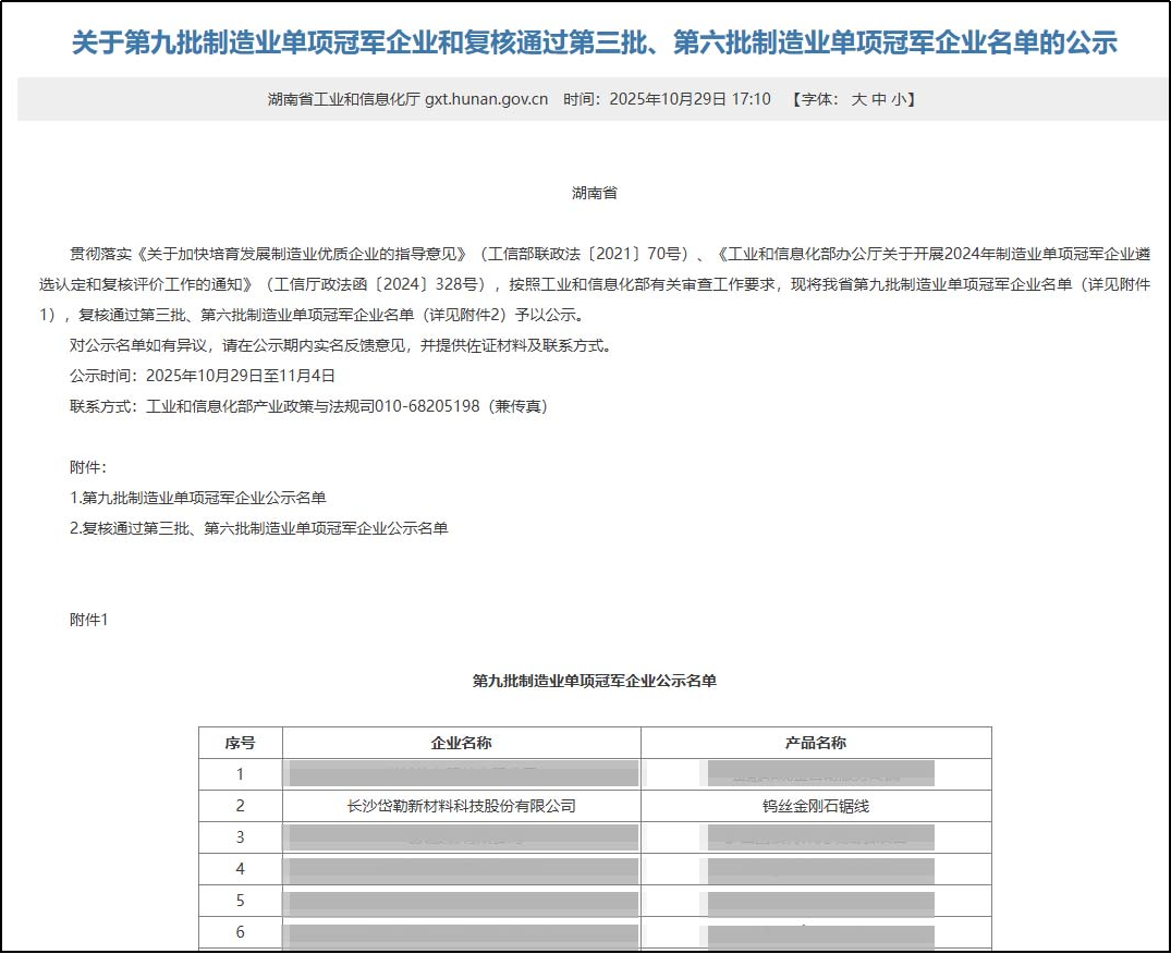 近日,工信部对第九批制造业单项冠军企业名单进行公示,岱勒新材凭借“钨丝金刚石锯线”产品的卓越表现成功入选,荣膺"制造业单项冠军"国家级殊荣。该项荣誉不仅是对岱勒新材多年来追求卓越、精益求精的权威认可与高度褒奖,更充分彰显公司在细分领域的技术创新、质量水平及市场占有率已跻身全国乃至全球领先行列。