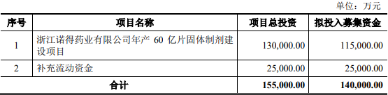 扣除发行费用后,天宇股份拟将募集资金用于浙江诺得药业有限公司年产60亿片固体制剂建设项目和补充流动资金。