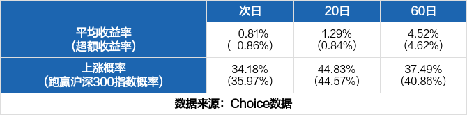 统计近一年的全市场数据,数据显示,共有1027只股票收到1963次问询函,其中671次第二日股价上涨,1175次股价下跌,全市场次日平均收益率为-0.81%,超额收益率为-0.86%。若将期限拉长,收到问询函后的一个月(20天)、三个月(60天)的平均超额收益率分别为0.84%、4.62%,跑赢指数的概率分别为44.57%、40.86%。