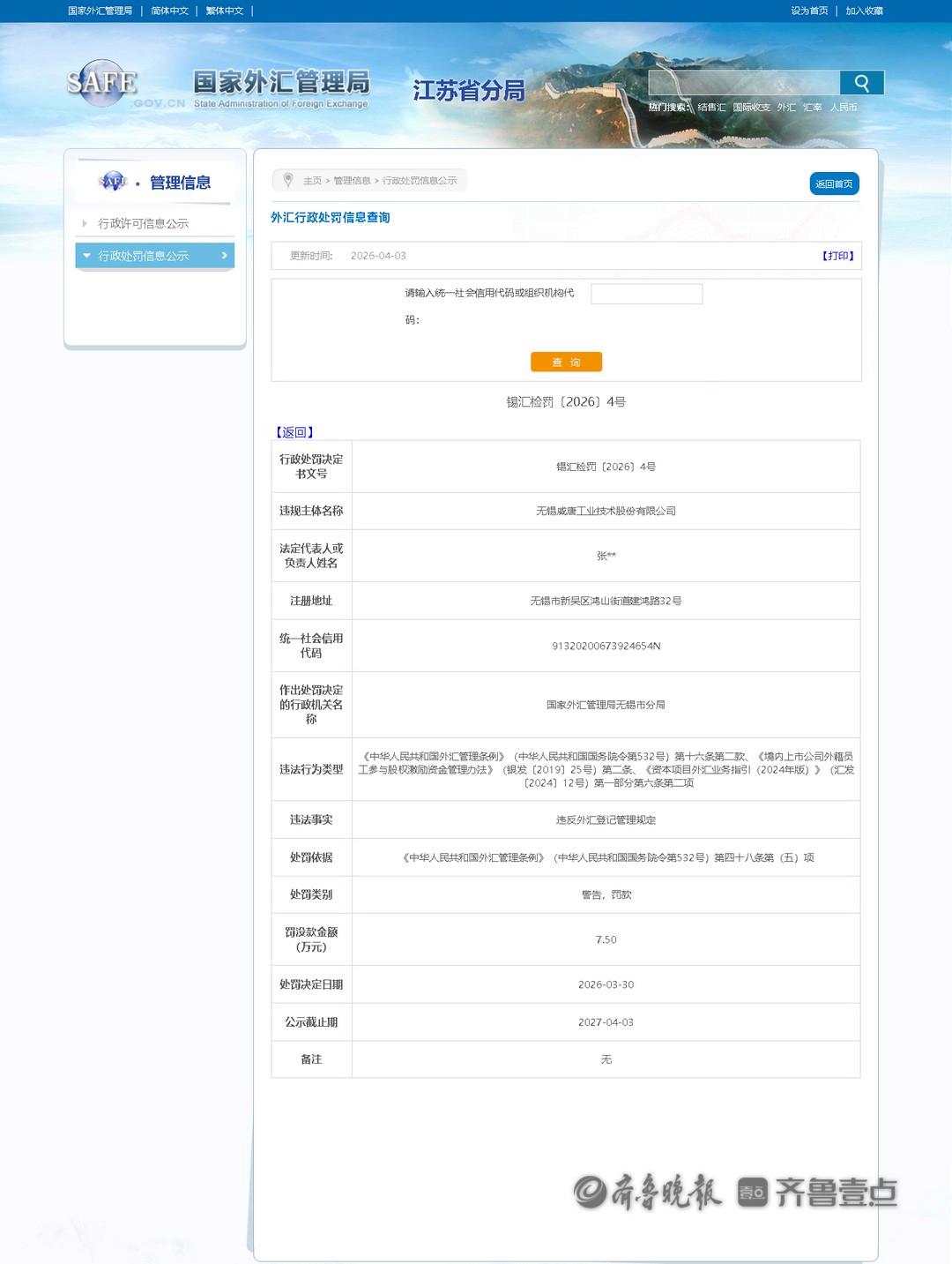 近日,齐鲁晚报·齐鲁壹点记者从国家外汇管理局江苏省分局行政处罚信息一栏获悉,威唐工业(300707)因违反外汇登记管理规定的行为,被国家外汇管理局无锡市分局警告,罚款7.5万元。