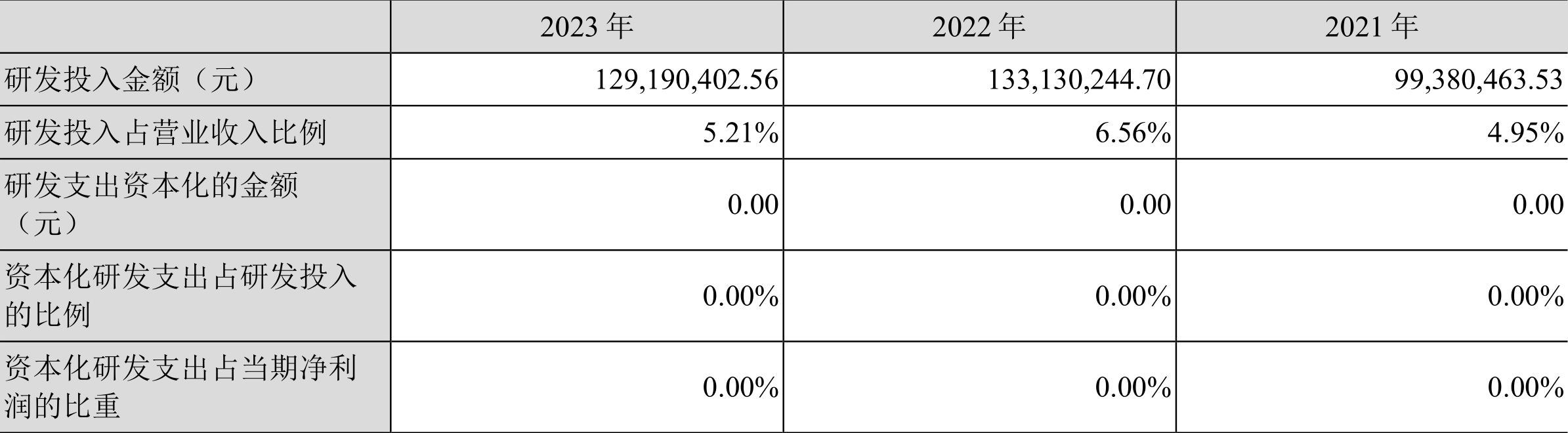 2023年全年,公司研发投入金额为1.29亿元,同比下降2.96%;研发投入占营业收入比例为5.21%,相比上年同期下降1.35个百分点。此外,公司全年研发投入资本化率为0。