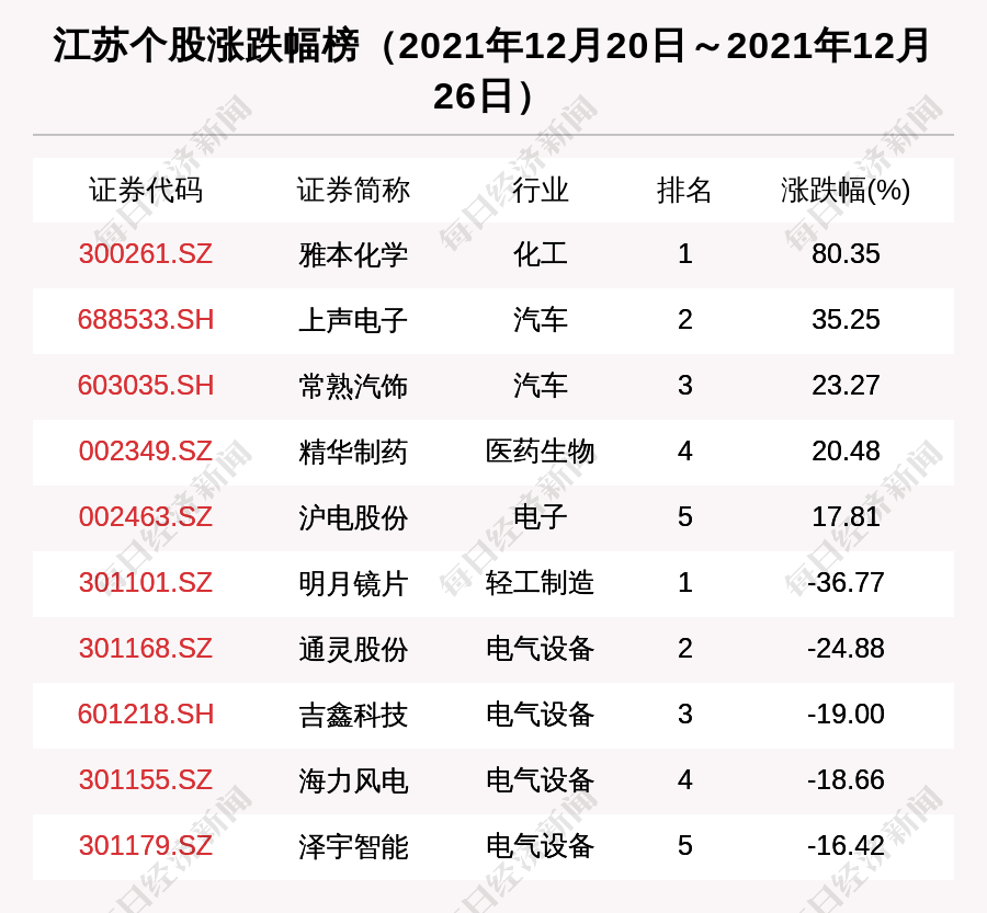 从涨跌幅来看,上周涨幅最大的江苏公司是雅本化学,上涨幅度为80.35%。跌幅最大的是明月镜片,下跌幅度为36.77%。