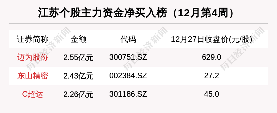 主力资金方面,12月第4周,迈为股份净买入额居首位,为2.55亿元,其次是东山精密(2.43亿元)和C超达(2.26亿元)。