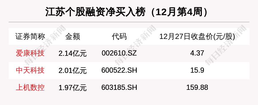 先看融资资金,12月第4周,江苏板块融资净买入总额为10.59亿元。融资净买入最多的江苏股是爱康科技,金额是2.14亿元。其次是中天科技(2.01亿元)和上机数控(1.97亿元)。