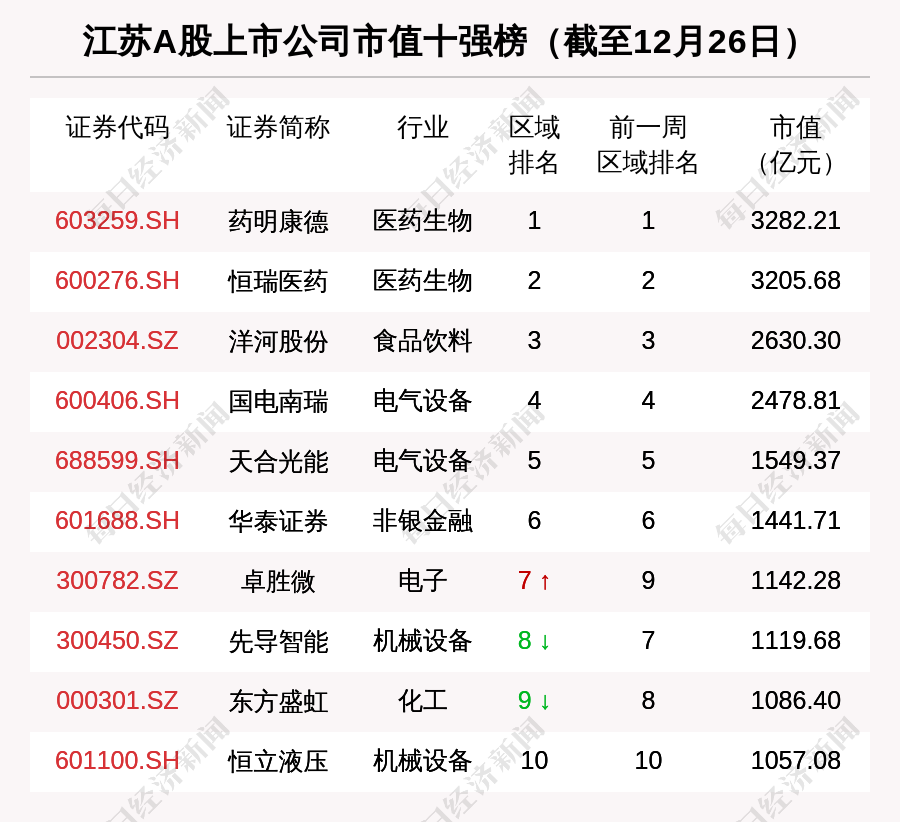 截至12月26日,江苏板块市值最大的是药明康德,市值最小的是旭杰科技。上周市值增长最多的是东吴证券,增长92.45亿元;市值缩水最多的是药明康德,缩水367.80亿元。