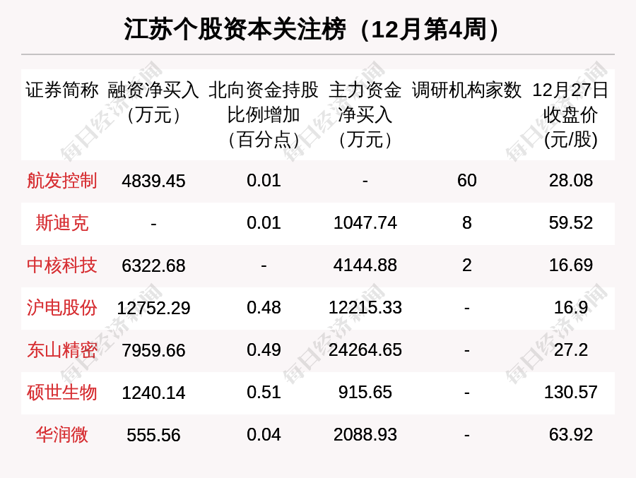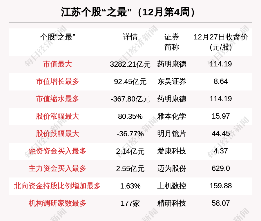 12月第4周(2021年12月20日~2021年12月26日),江苏股中,东吴证券市值增长最多;药明康德市值缩水最多;涨幅最大的是雅本化学,上涨幅度为80.35%;跌幅最大的是明月镜片。此外,航发控制被60家机构调研,且同时被北向资金,融资资金看好。