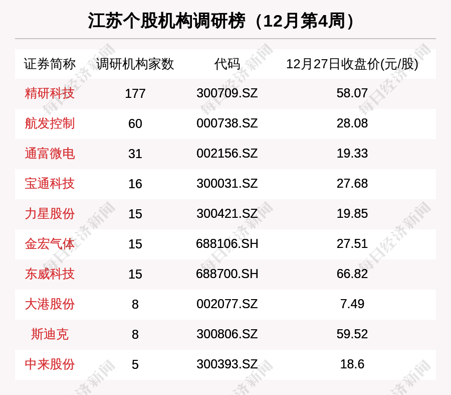 机构调研方面,据统计,12月第4周,有22家江苏上市公司接受机构调研。其中,177家机构到访精研科技,60家机构到访航发控制,31家机构到访通富微电,16家机构到访宝通科技,15家机构到访力星股份。